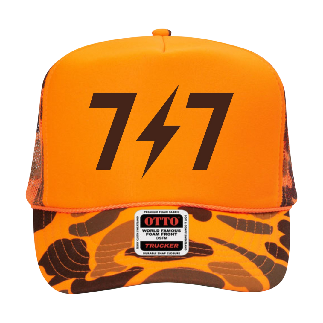 Otto 5 Panel High Crown Mesh Back Trucker Hat Polyester Foam Front (Orange Camo) - 717 embroidered. Warren Zeiders embroidered on back. Adjustable backstrap. One size fits most.